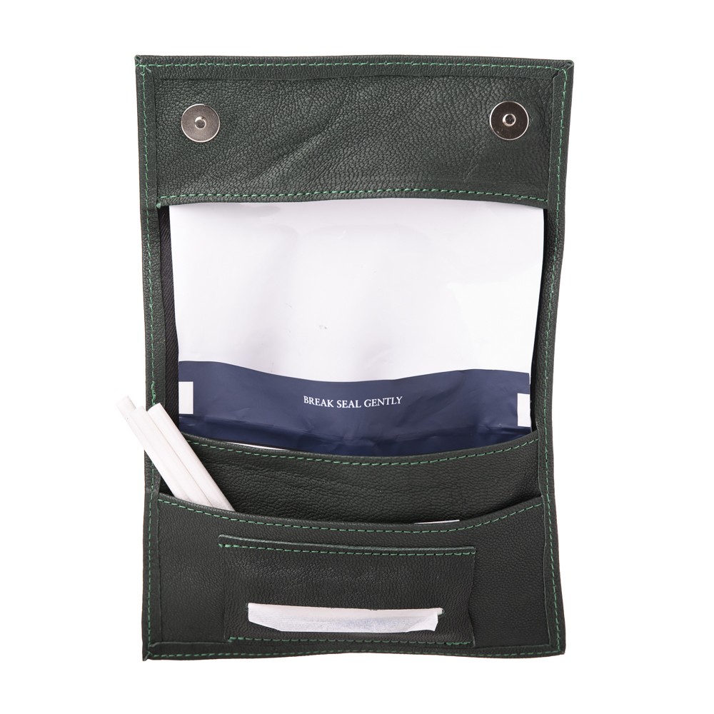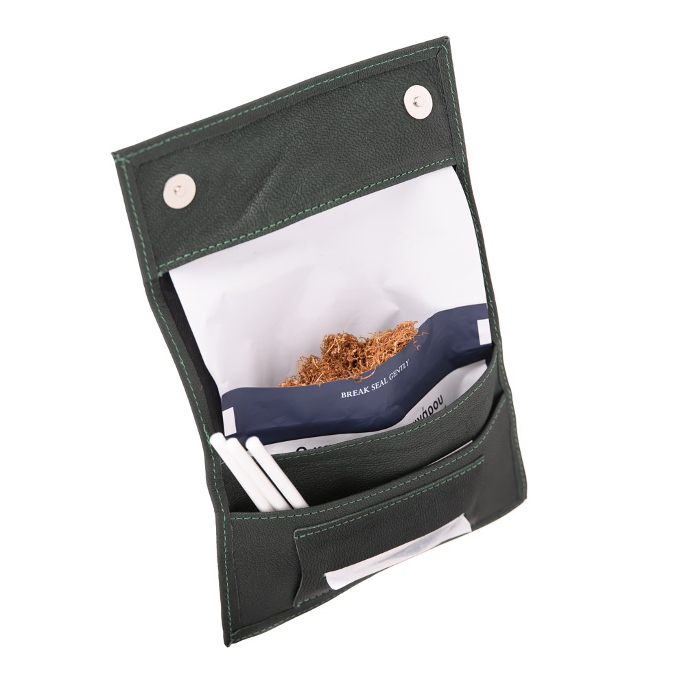 Δερμάτινη καπνοθήκη ελληνικής κατασκευής, διαστάσεων 15×1×8 (Μ×Π×Υ), μαλακό δέρμα που διπλώνει σαν φάκελος και ασφαλίζει με διπλό ισχυρό μαγνήτη, ειδική θήκη τοποθέτησης καπνού μαζί με τη συσκευασία, ειδική θήκη για χαρτάκια θήκη για φιλτράκια και αναπτήρα, υφασμάτινη φόδρα εσωτερικά.