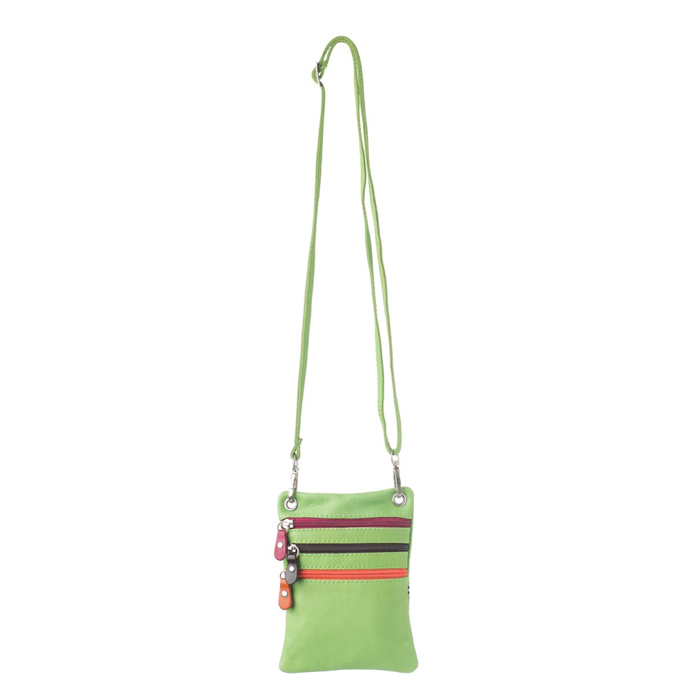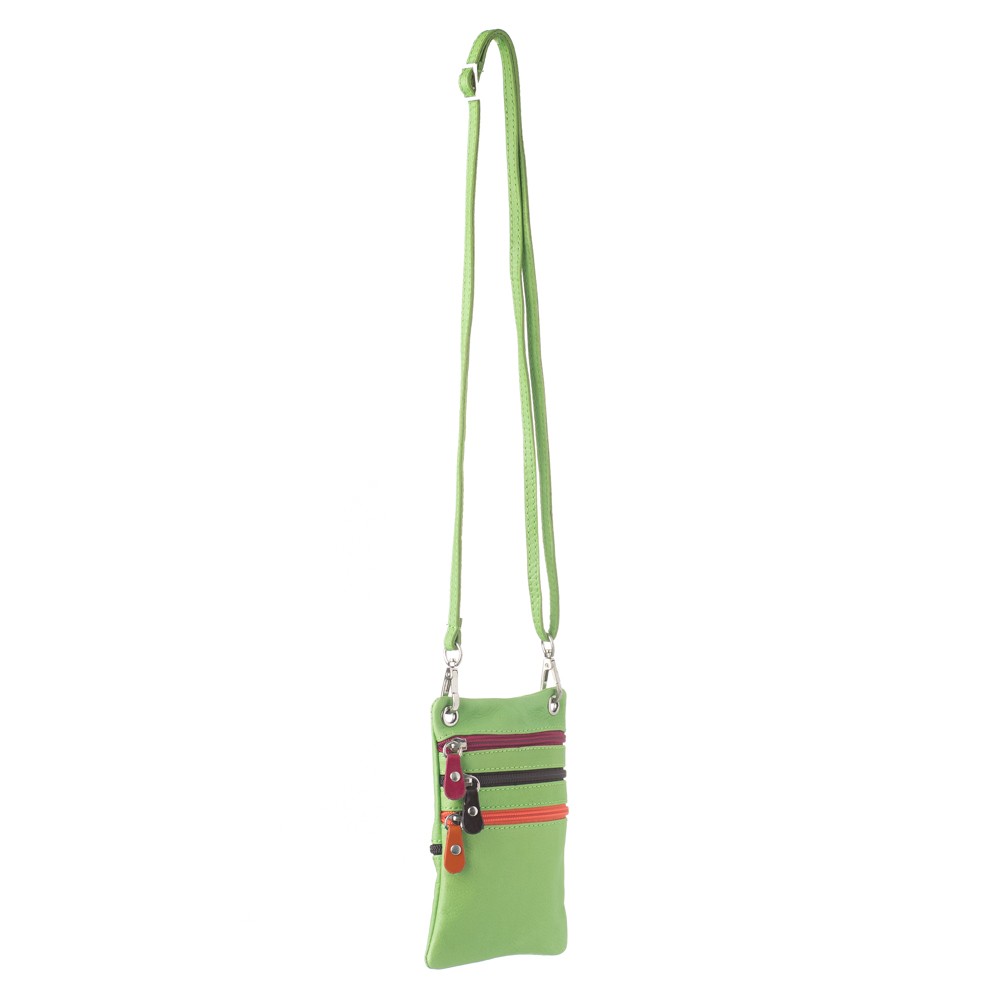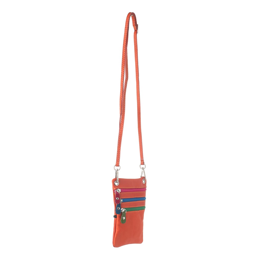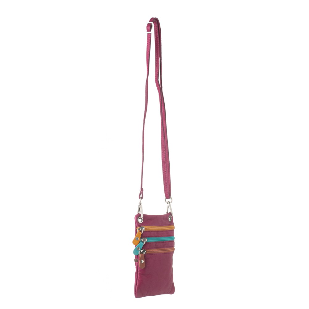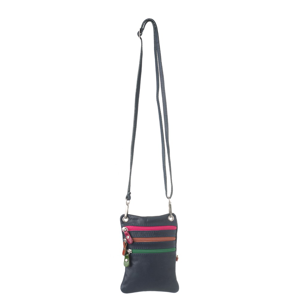 Γυναικεία δερμάτινη τσάντα χιαστί, ιταλικής προέλευσης, διαστάσεων 14×1×19 (Μ×Π×Υ), τρείς εξωτερικές τσέπες μπροστά που ασφαλίζουν με φερμουάρ, εξωτερική τσέπη πίσω που ασφαλίζει με φερμουάρ, θηλιά για τοποθέτηση σε ζώνη, υφασμάτινη φόδρα, αφαιρούμενος ρυθμιζόμενος ιμάντας για κράτημα στον ώμο ή χιαστί.