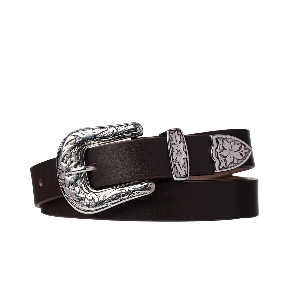 Επιλέγουμε τα καλύτερα δέρματα και συνεργαζόμαστε με Ιταλούς τεχνίτες για να δημιουργήσουμε ζώνες που ξεχωρίζουν για την ποιότητα και την αισθητική τους. Γυναικεία ζώνη 2,5εκ πλάτους. μονοκόμματο δέρμα, και χειροποίητης ιταλικής κατασκευής με έμφαση στο western ύφος, διακοσμημένη με ανάγλυφη μεταλλική αγκράφα, θηλιά και τελείωμα. Ο σχεδιασμός της ξεχωρίζει χάρη στις λεπτομερείς floral χαράξεις και το vintage αποτέλεσμα, κάνοντάς την ιδανική επιλογή για όσες θέλουν ένα πιο ιδιαίτερο και στιλιστικό αξεσουάρ. Το λείο υλικό προσφέρει σταθερή εφαρμογή και άνεση, ενώ η ανθεκτική κατασκευή διατηρεί το σχήμα της ζώνης σε καθημερινή χρήση. Ταιριάζει εξαιρετικά με jeans, φορέματα και ζεστά φθινοπωρινά looks, προσθέτοντας έναν τόνο western κομψότητας. Παραδίδεται μέσα σε κομψό υφασμάτινο πουγκί, ιδανικό και για δώρο.