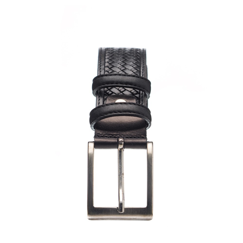 Men's leather belt, Made in Italy, Width: 3.5 cm, for all trousers, silver metal buckle, inside and outside matte leather, geometric knitting stamp, with two loops for better grip, gauze on the side of the belt.
