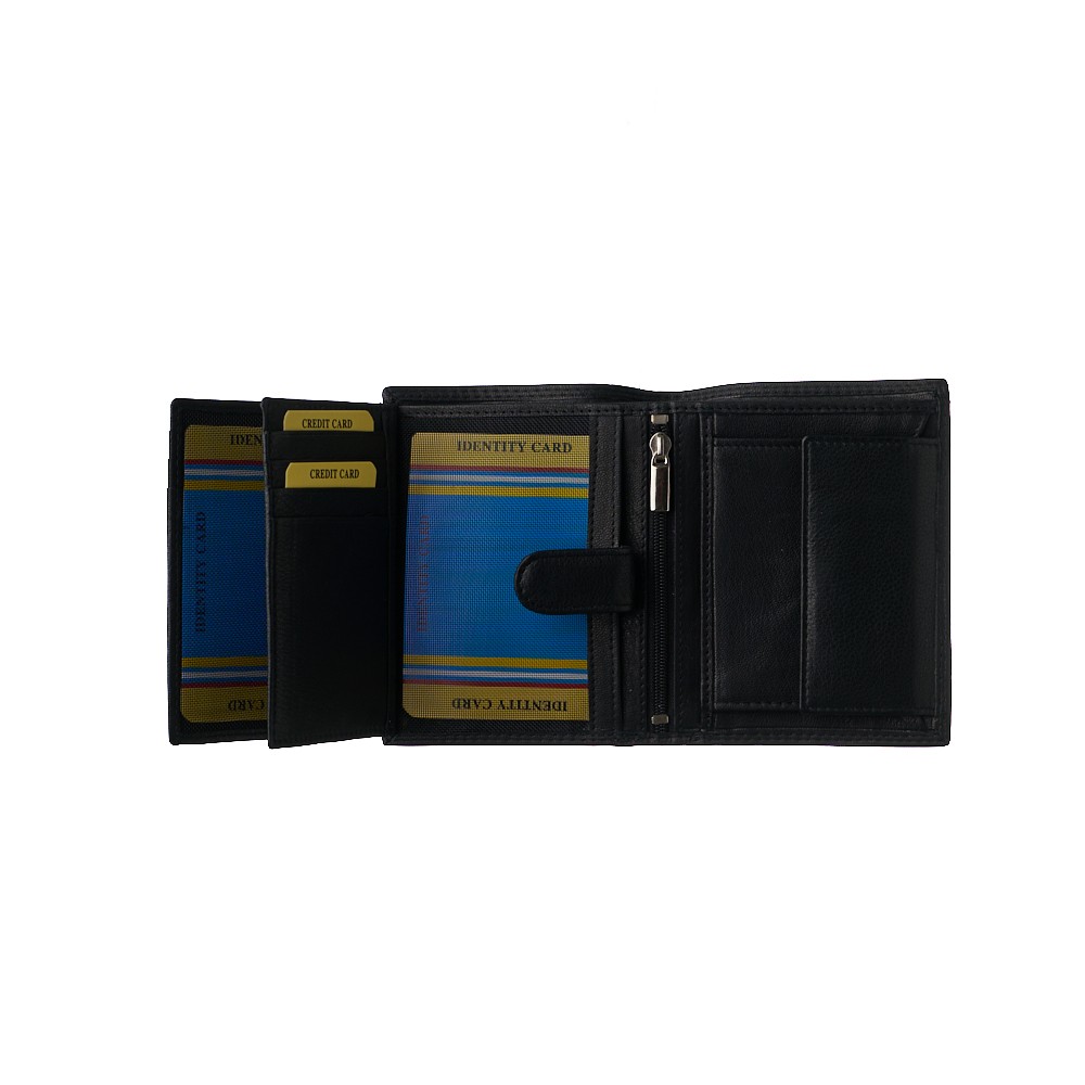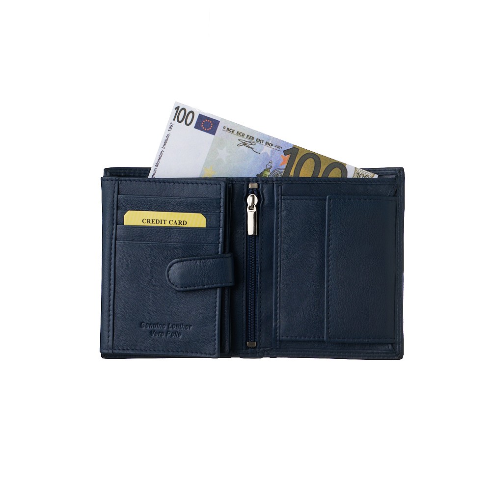 Men's leather wallet, of Italian origin, dimensions 10x12.5 (LxH), soft leather, two bill slots, 8 card slots, slot behind card slots, three transparent photo slots, spacious center zippered pocket, interior trunnion clasp, coin holder that secures with a metal clasp - comes in a gift box.
