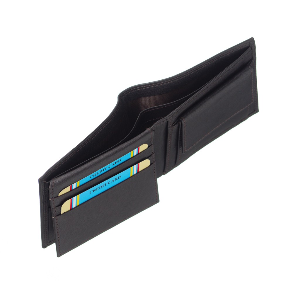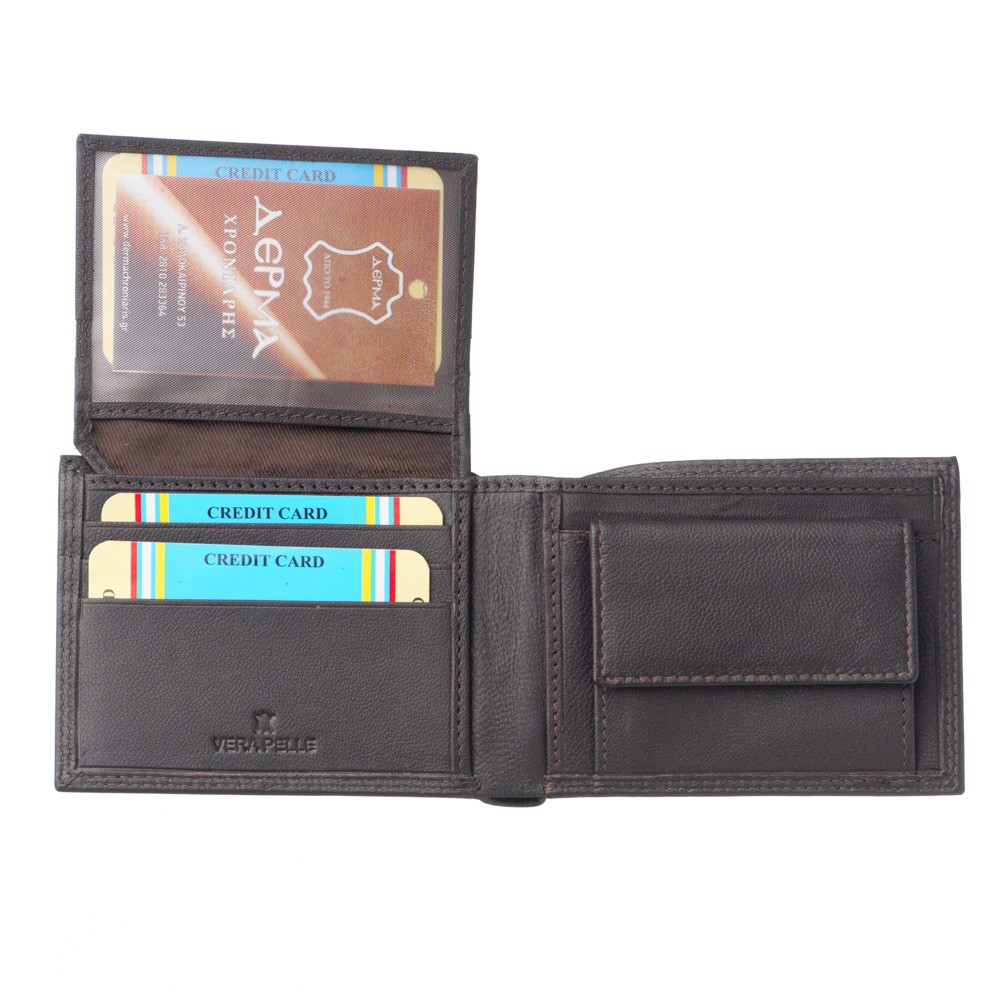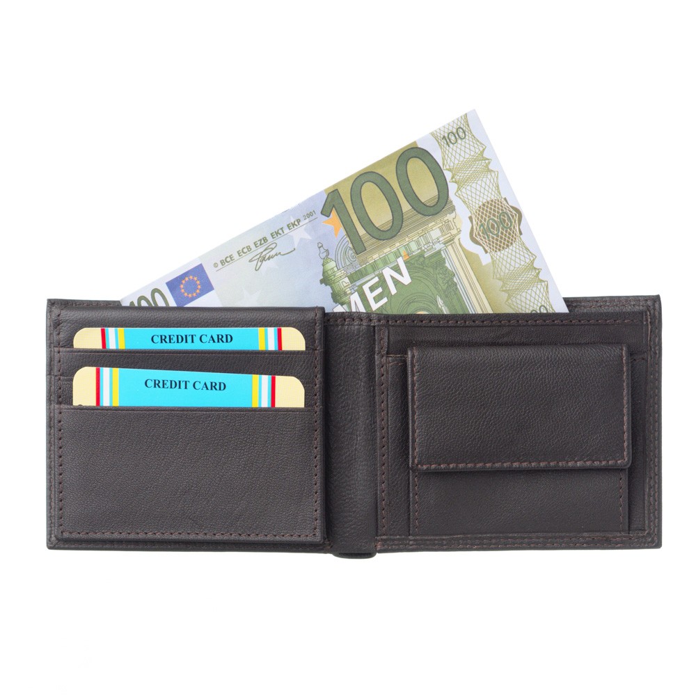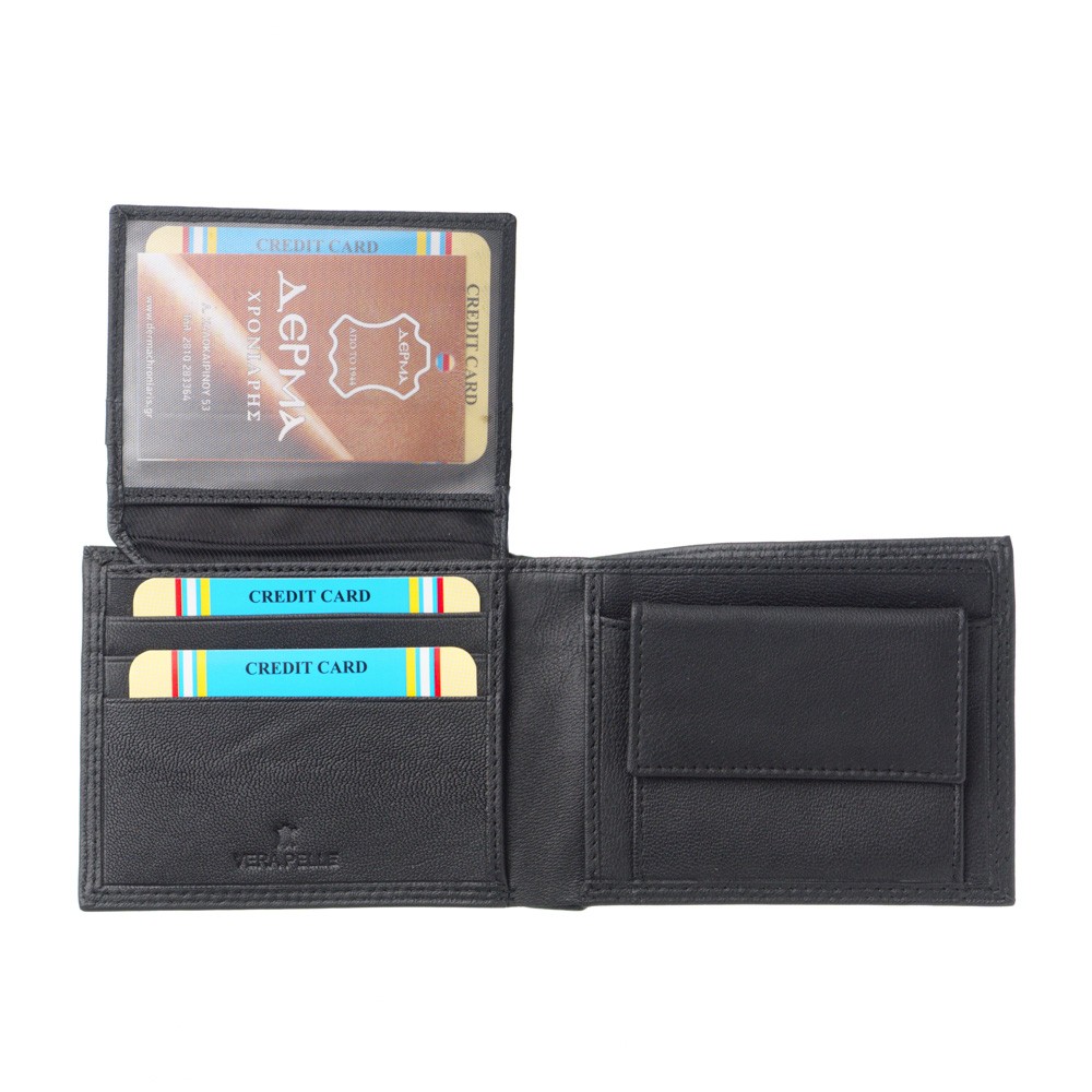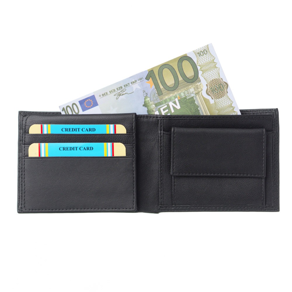 Men's wallet, of Italian origin, dimensions 11 × 9 (LxH), soft leather, two places for banknotes, six cases for credit cards, place behind card and coin cases, case with transparency for photos, case for coins that secures with trunk, hidden case behind the coin case, also available in a gift box.