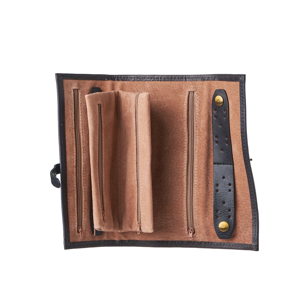 Italian-made leather jewelry case, dimensions 21 x 8.5 (LxH) closed and 21 x 26.5 (LxH) open, secures with a multi-position clasp, six zippered pockets, special earring openings, detachable necklace and bracelet holder.