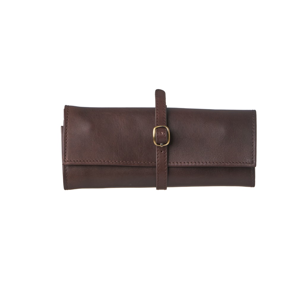 Italian-made leather jewelry case, dimensions 21 x 8.5 (LxH) closed and 21 x 26.5 (LxH) open, secures with a multi-position clasp, six zippered pockets, special earring openings, detachable necklace and bracelet holder.