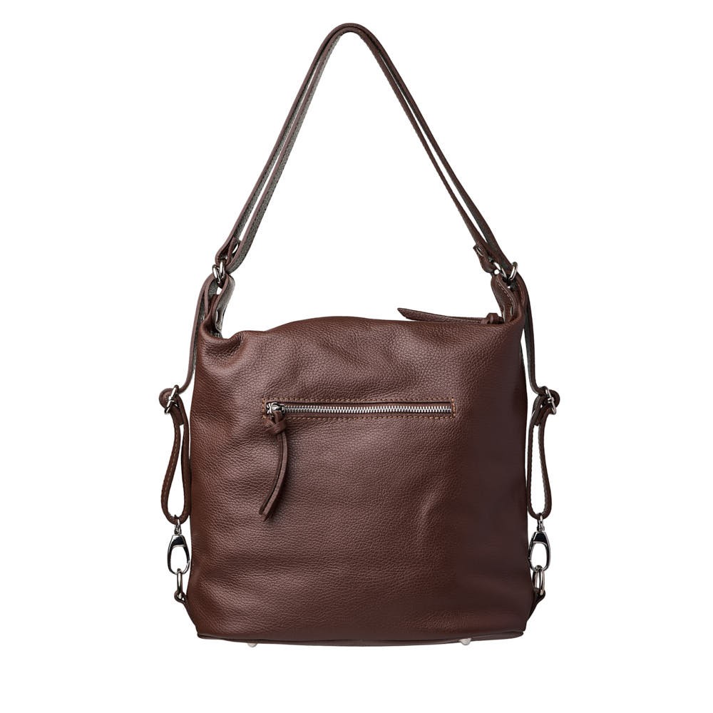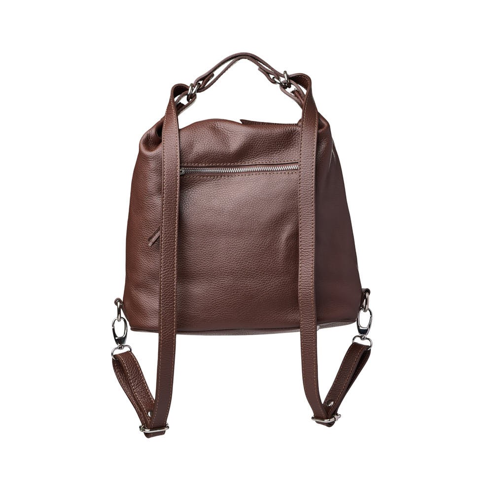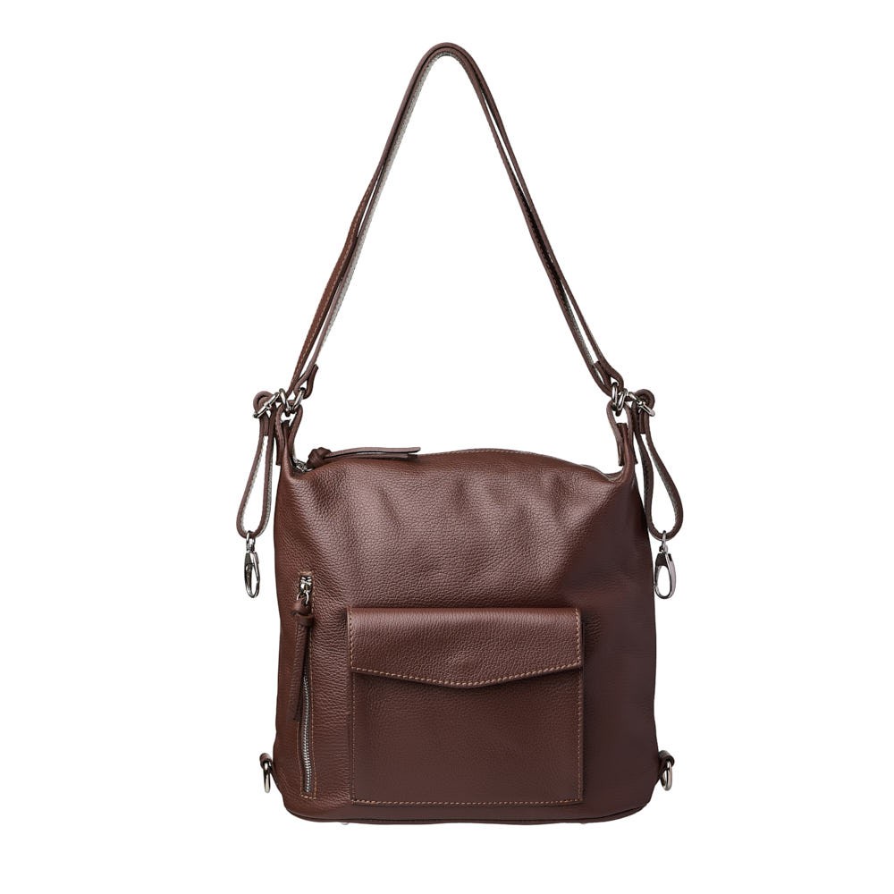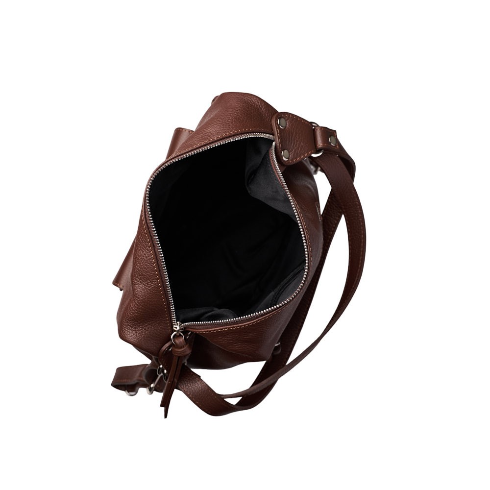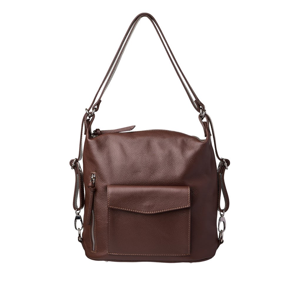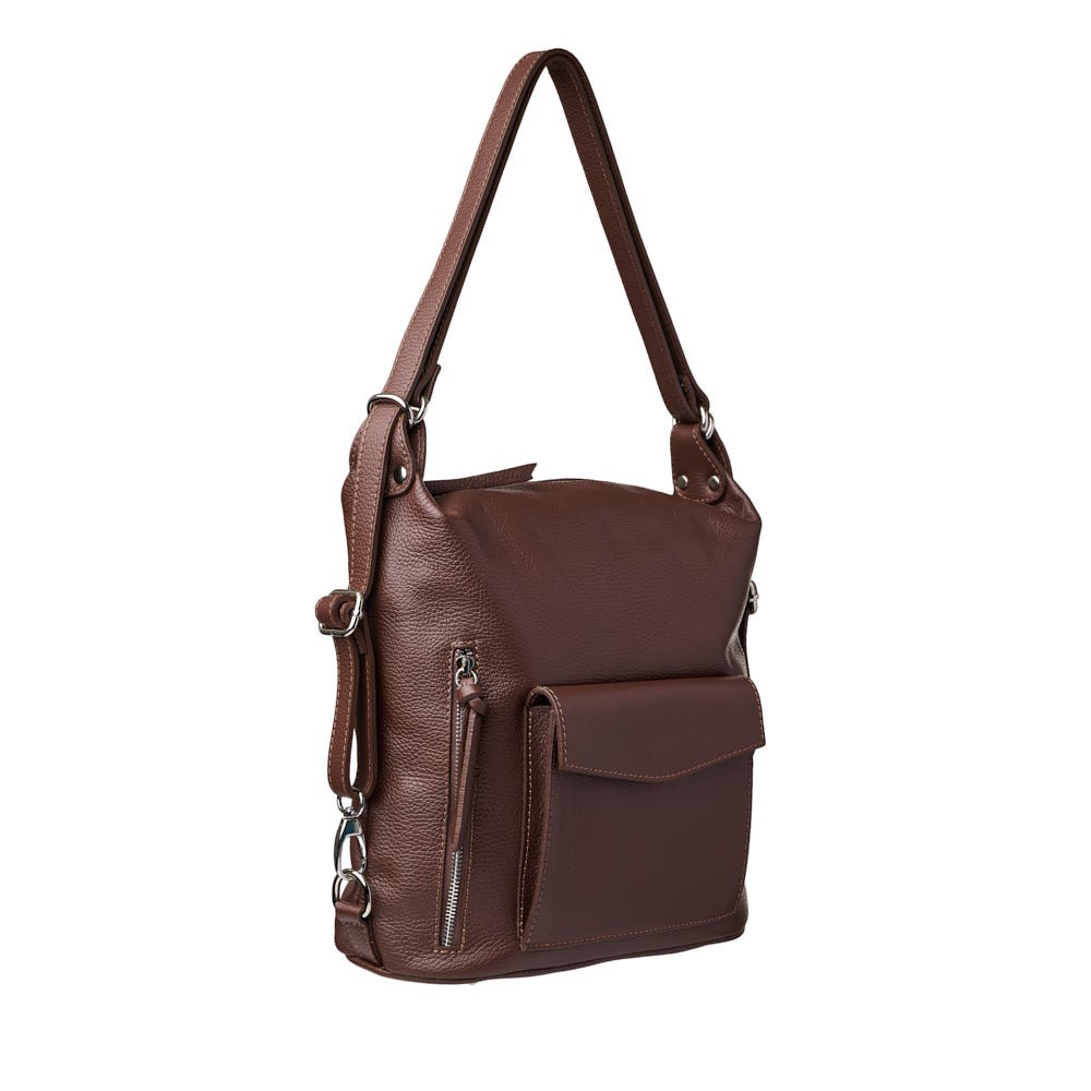 Women's leather bag, made in Italy, dimensions 32x14x29 (LxWxH), 3 in 1 (shoulder - backpack - crossbody), one main position secures with zipper, inner pocket with zipper, places for mobile phone and small items, adjustable strap for holding on cross, two outer front seats for easy access (one secures with a strong magnet and the other with a zipper), outer back pocket with zipper.