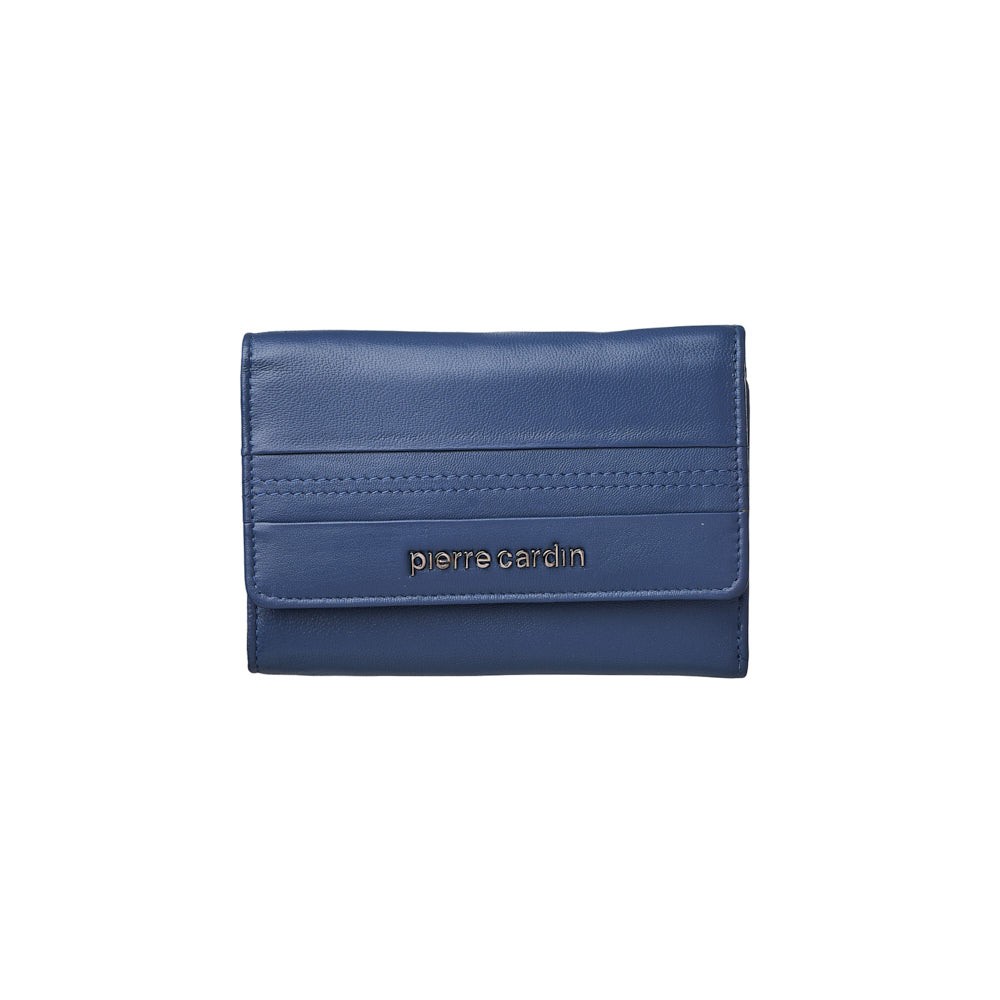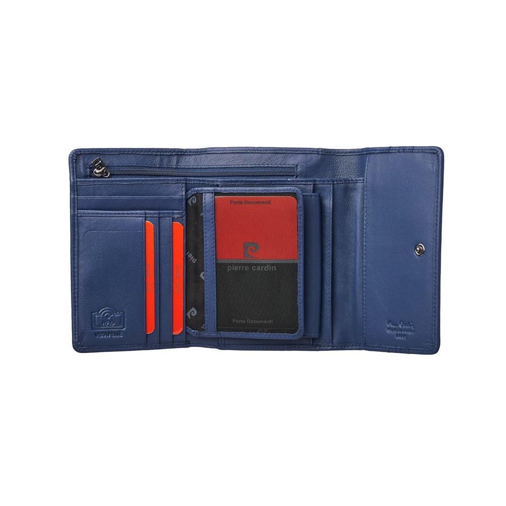 Pierre Cardin women's wallet, dimensions 16 x 10.5 cm (LxH), made of soft genuine leather in bright colors. It has two compartments for banknotes, one of which is secured with a zipper, as well as a space for coins that is secured with a zipper on the inside. It includes 9 card slots, a pocket with a transparent window for ID or photos and additional interior spaces for documents or receipts. It secures with a metal button, while the Pierre Cardin logo adorns the front. Available in a gift box.