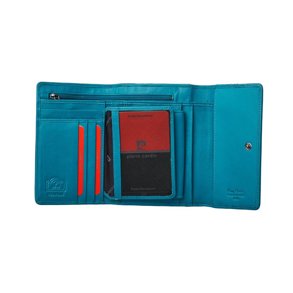 Pierre Cardin women's wallet, dimensions 16 x 10.5 cm (LxH), made of soft genuine leather in bright colors. It has two compartments for banknotes, one of which is secured with a zipper, as well as a space for coins that is secured with a zipper on the inside. It includes 9 card slots, a pocket with a transparent window for ID or photos and additional interior spaces for documents or receipts. It secures with a metal button, while the Pierre Cardin logo adorns the front. Available in a gift box.