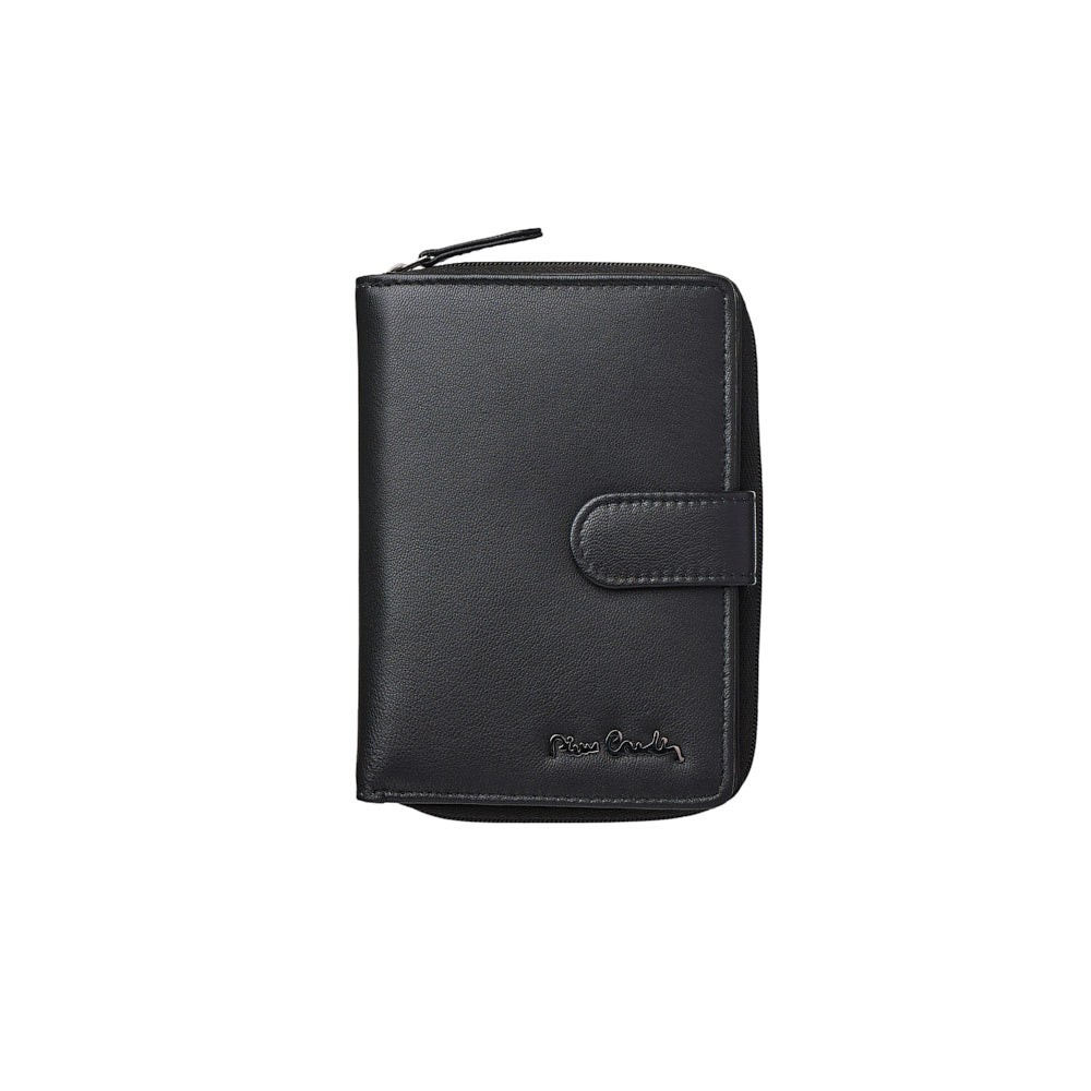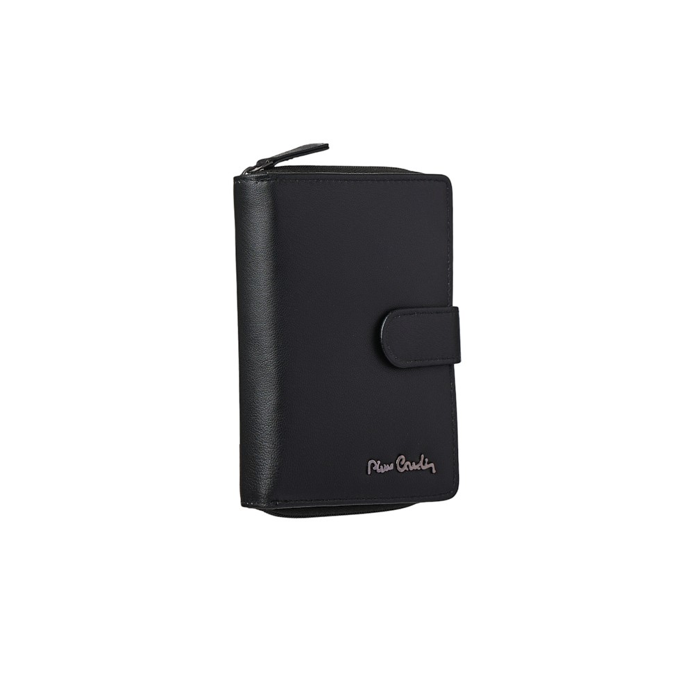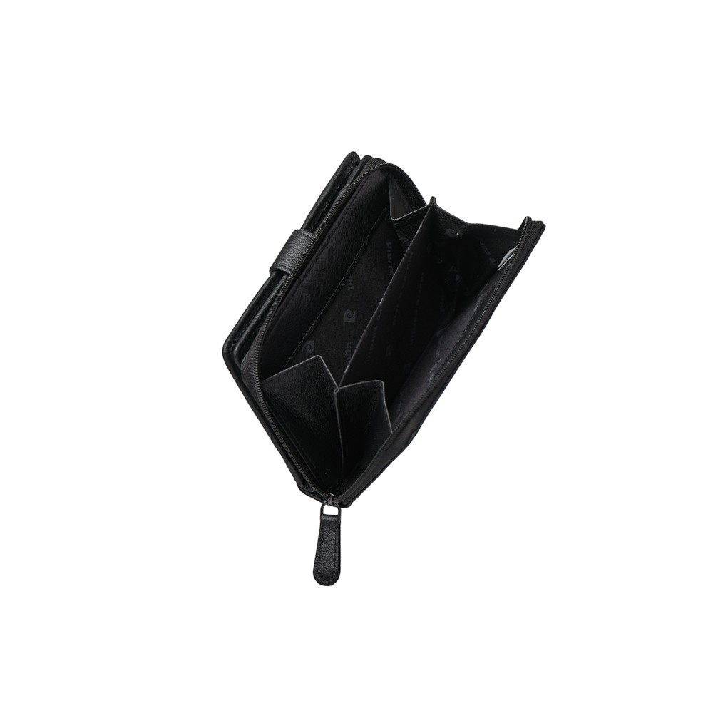 Women's wallet, dimensions 14 x 10 (LxH), soft leather, one narrow compartment for banknotes behind the card slots, coin pocket with zipper at the top, nine card slots, one transparent compartment for photos or ID, additional internal compartments behind the card slots, secures with a button, available in a gift box. The Pierre Cardin logo adorns the front, adding distinctive style.